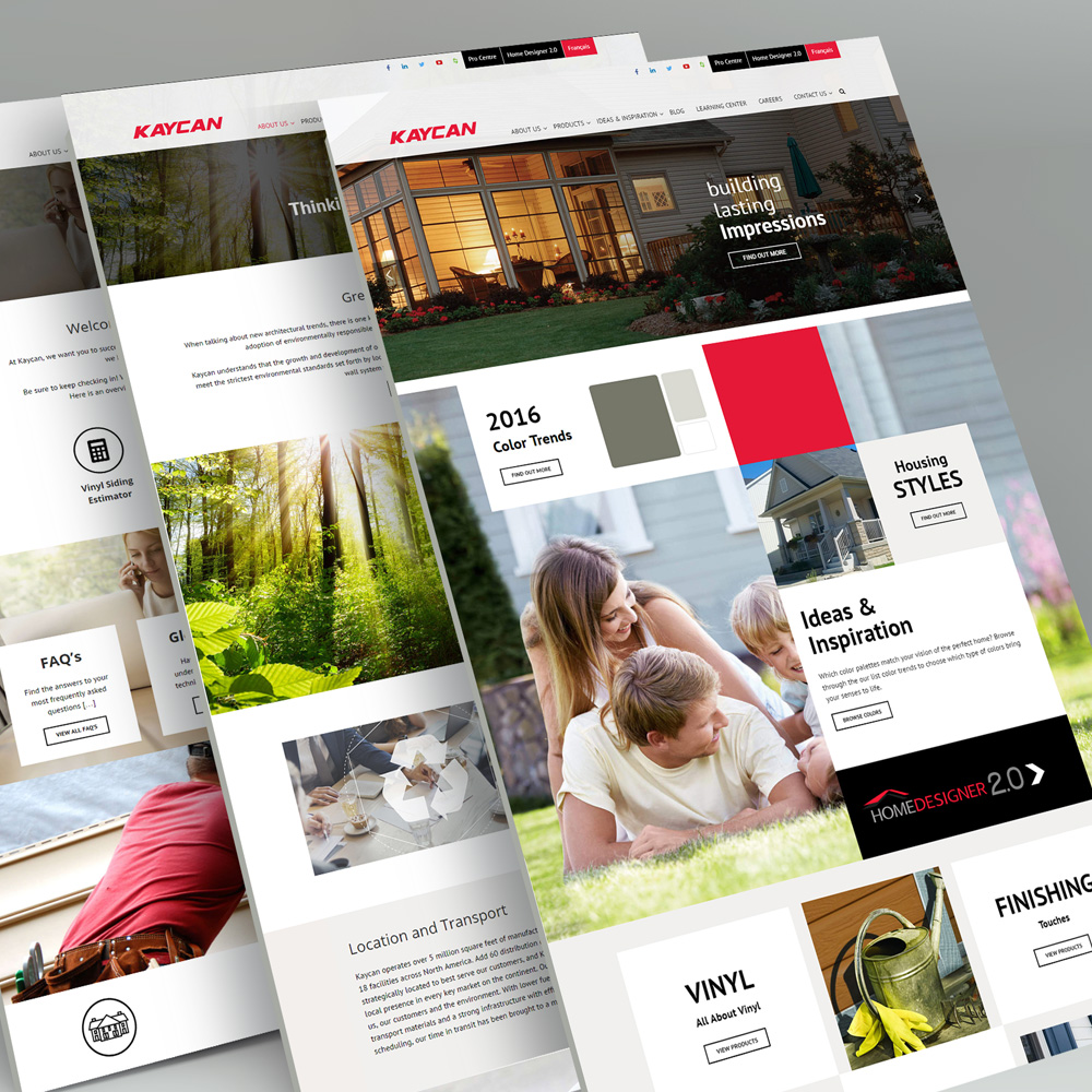 Kaycan is a siding and building solutions provider who was looking to update their web branding and modernize their website. Lifestyle imagery and pops of bright color are used to create a personal connection, bridging the gap between the physical product and its ability to make a house a home.