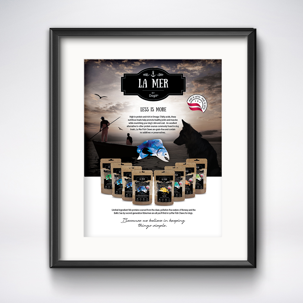 La Mer dog treats are simple ingredient treats that are made in Latvia from fish caught in the Baltic Sea. The packaging needed to look natural and current but include a visual link to the baltic fisherman heritage that permeates its production.