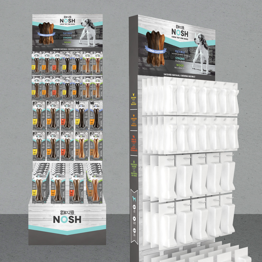 Nosh is a tasty durable chew toy line, for dogs, that Rolf C. Hagen was looking to package elegantly. Black and white imagery was used to give it a timeless feel, while a table cloth checkerboard pattern was added to provide a visual association to snacking or “noshing”. Various dog imagery and colors were used to separate the line into flavors and bone sizes.